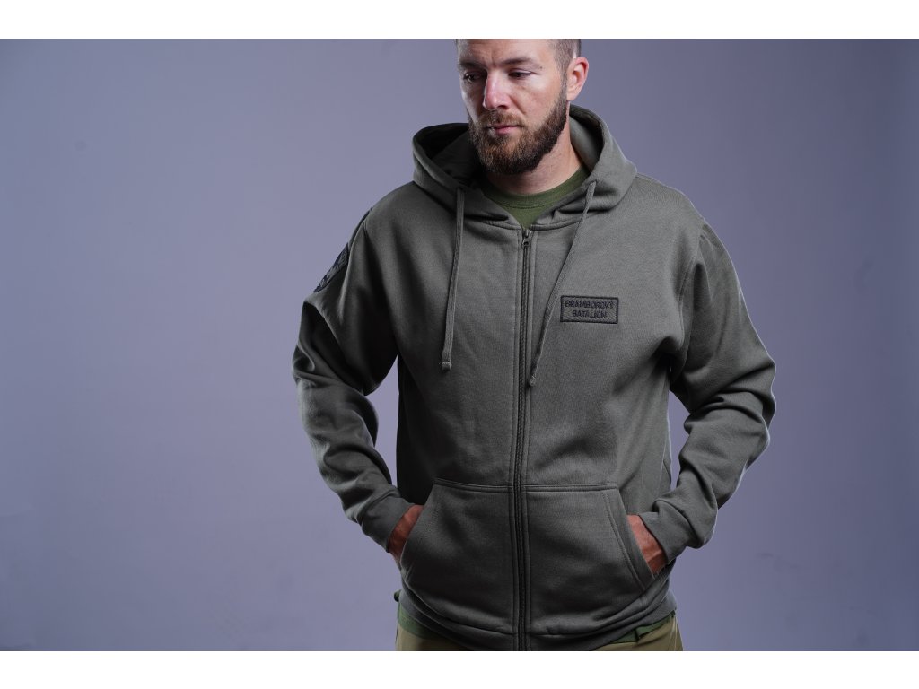 Je to mikina. Má zip. Je olivová. Má zažehlené a obšité nášivky místo nálepek, aby to něco vydrželo.